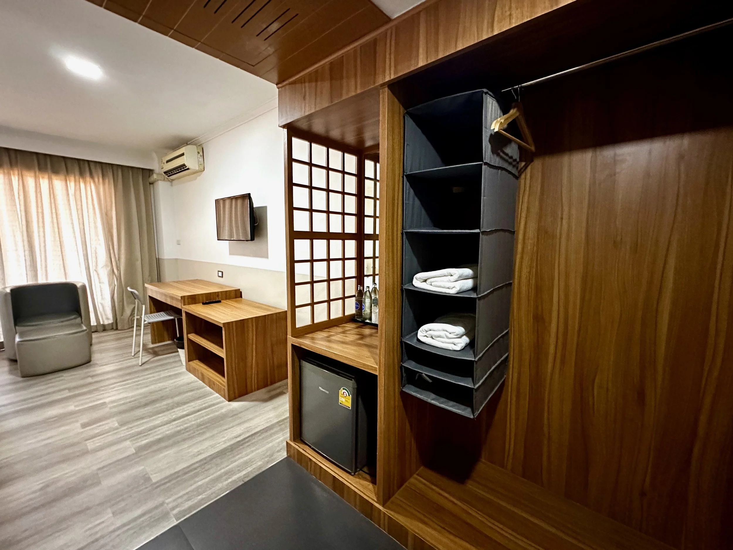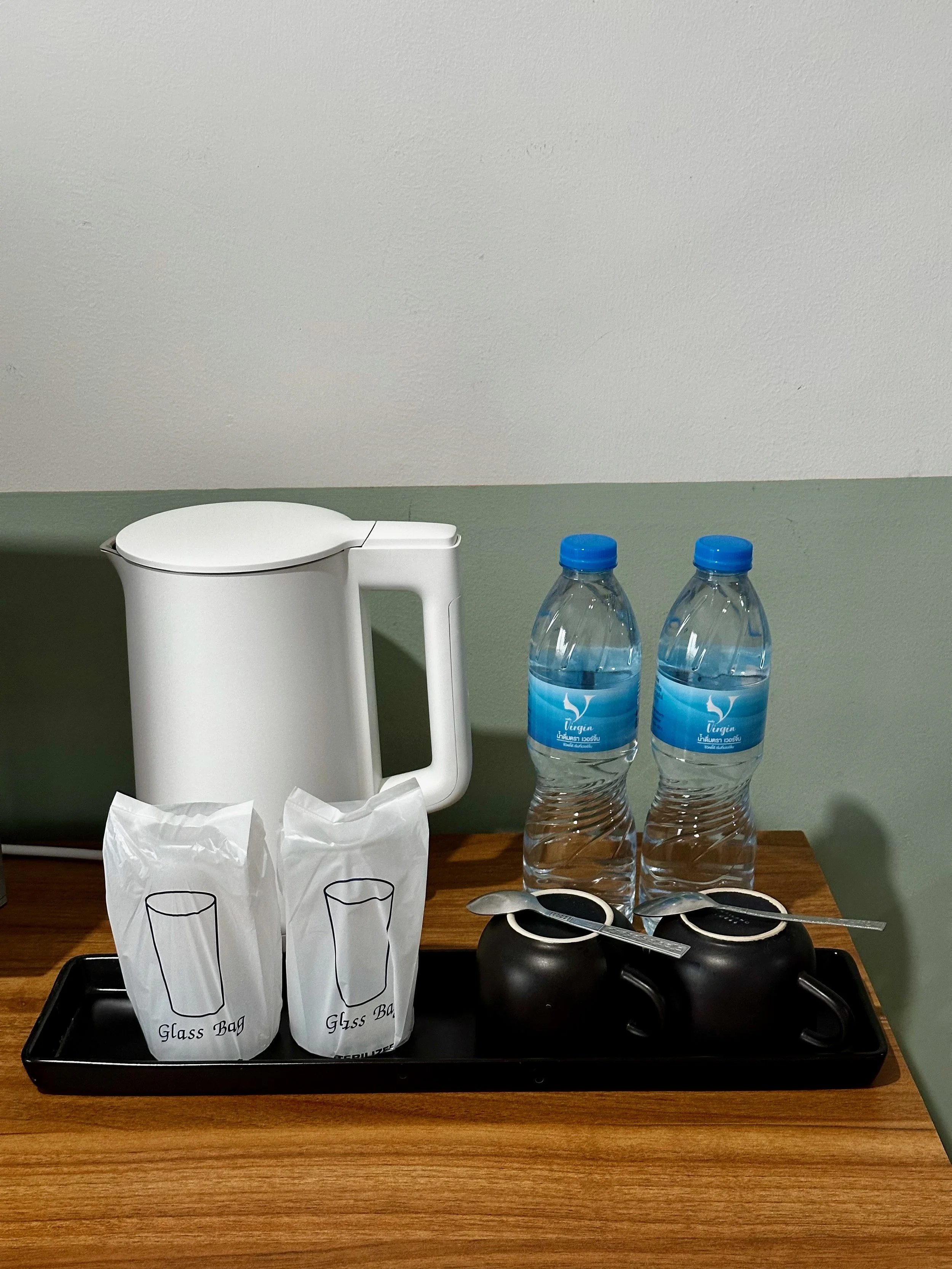 Every room is equipped with a TV, refrigerator, hot kettle, hair dryer, and complimentary bottled water and instant coffee.